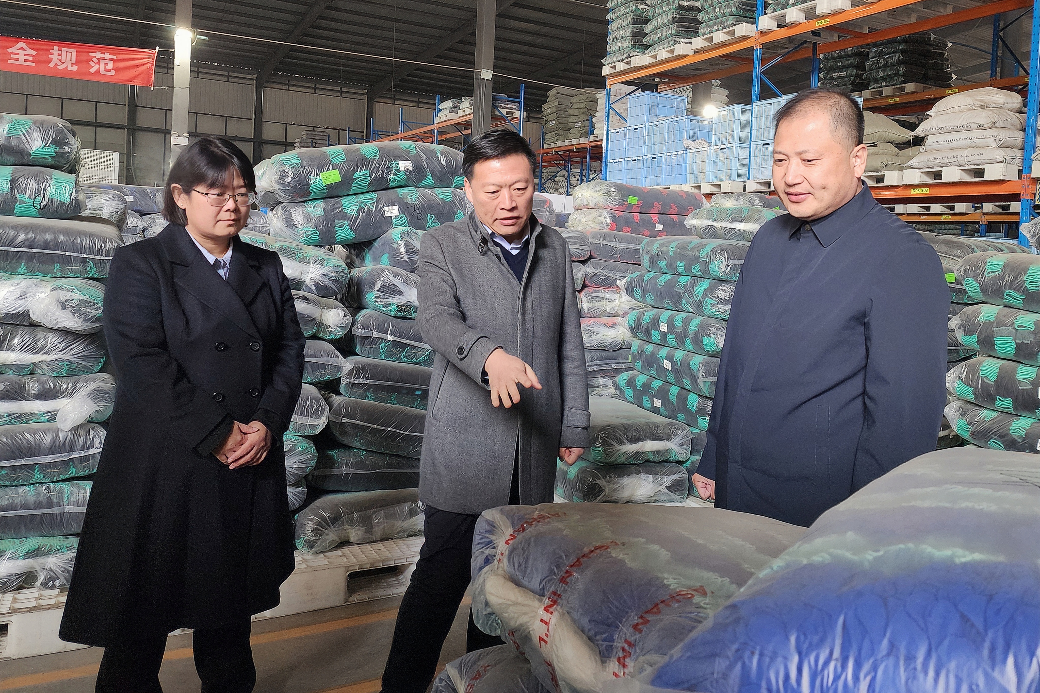倪善峰(中)向平邑農(nóng)商銀行工作人員介紹企業(yè)生產(chǎn)及銷售情況 平邑農(nóng)商銀行供圖